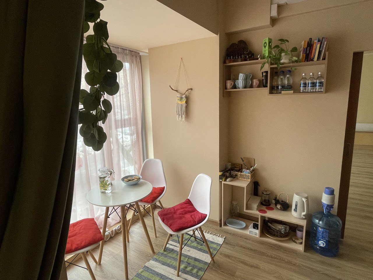 -Зал 45 кв.м (общая площадь 70 кв.м) -Вместимость зала до 25 человек -Кондиционер, работающий как на охлаждение, так и на тепло. -Приглушённый мягкий свет вечером -Место для чая и отдыха/перерыва -Чай, чайник, вода (5 литров входит а стоимость) Если нужно больше за дополнительную плату предложим 19л ёмкость (600 рублей) -В студии есть 15 чашек, 3 блюда для вкусняшек. По желанию арендатор приносить свои. -Стулья 15 шт, столы 2, коврики 12 шт, пледы, подушки, флипчарт, фломастеры. -Музыкальная колонка jbl -Раздевалка, свой с/у.